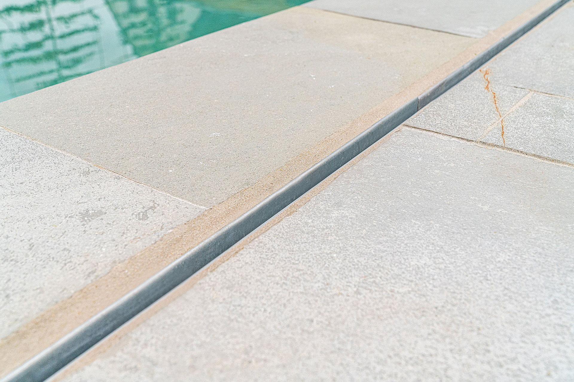 Dazu der Wunsch nach gerader Linienführung, puristischem Design im Betonlook, vergrauendem Holzbelag auf der Terrasse und einem Beckenkörper aus Sichtbeton. Es kam wie es kommen musste – der Pool wurde örtlich in feinster Handwerkskunst und Sichtbetonoptik betoniert und anschließend mit einer Poolrandplatte aus Kalkstein belegt. Die lediglich gespaltene Oberfläche verleiht dem Pool, sowie seinem Umgang und weitere Flächen, eine natürliche und dennoch konsequent cleane Optik. Zur Poolinnenseite sind sämtliche Platten in unserer Manufaktur mit einem geraden Diamantsägeschnitt, sowie einer handwerklich hergestellten, bleistiftrunden Kante ausgeführt worden. Um die Optik auch im Beckenumlauf zu gewährleisten sind sämtliche Ablaufrinnen als Schlitzrinnen ausgebildet und mit Naturstein belegt worden. Toll!